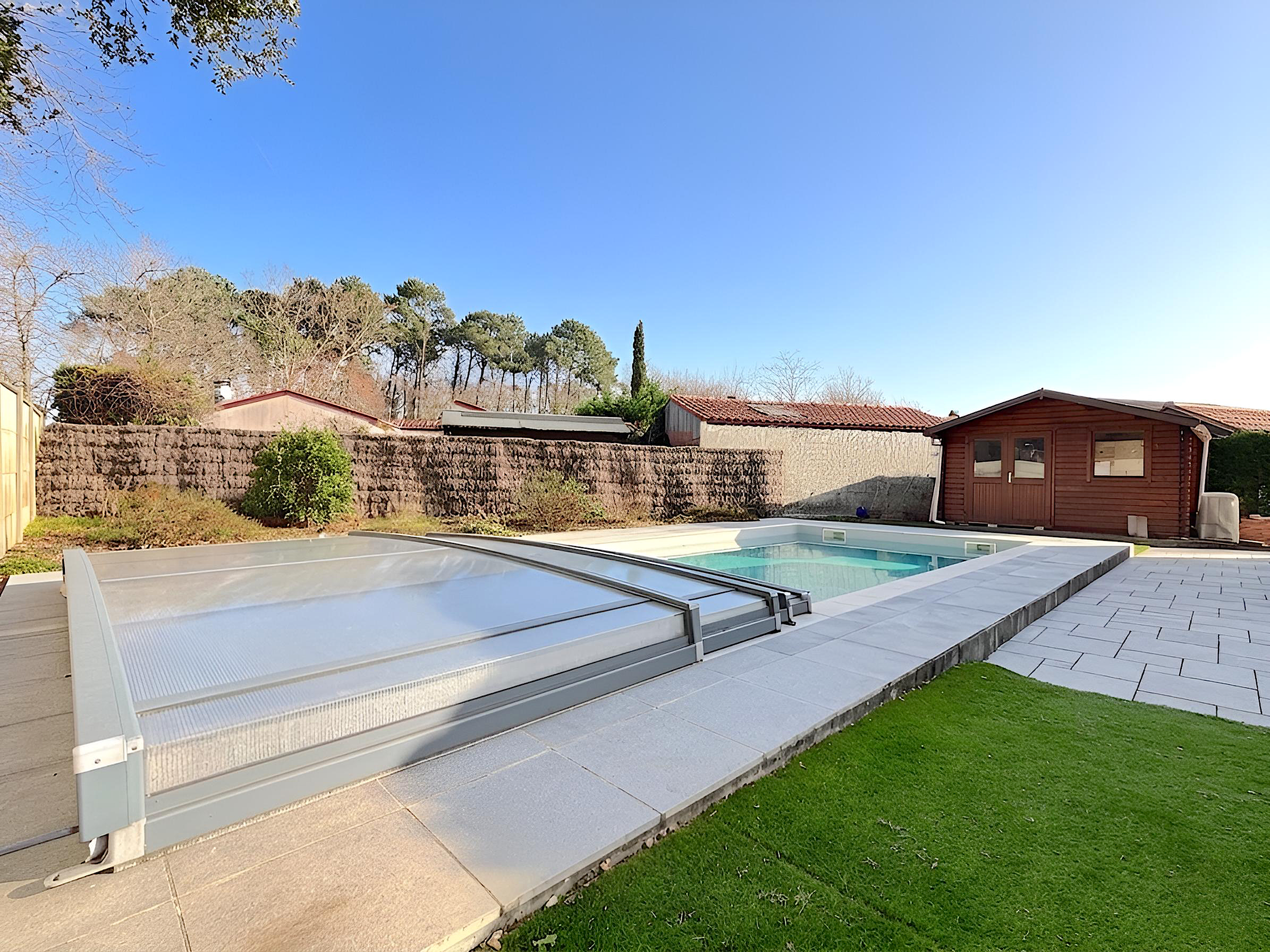 UN ESPACE entièrement CARRELÉ avec PISCINE CHAUFFÉE sous dôme de 8X4 m au sel, CABANON 4X3 sur dalle béton