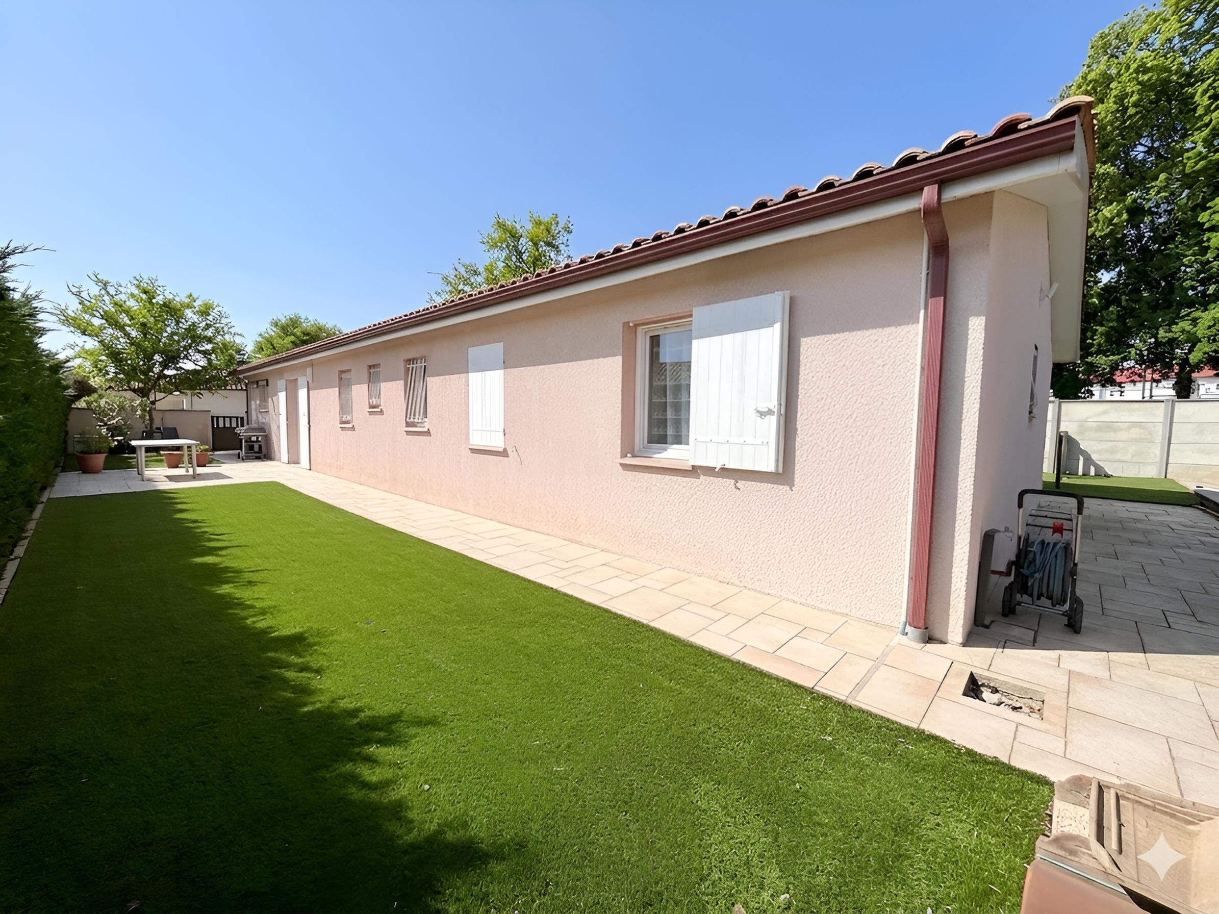 Maison TRAVERSANTE 125 m2 PLAIN PIED 4 CH – 2 WC – 2 SDB – Terrain 636m2 avec PISCINE CHAUFFEE – 3 TERRASSES – AIRE STATIONNEMENT – Secteur Boetie